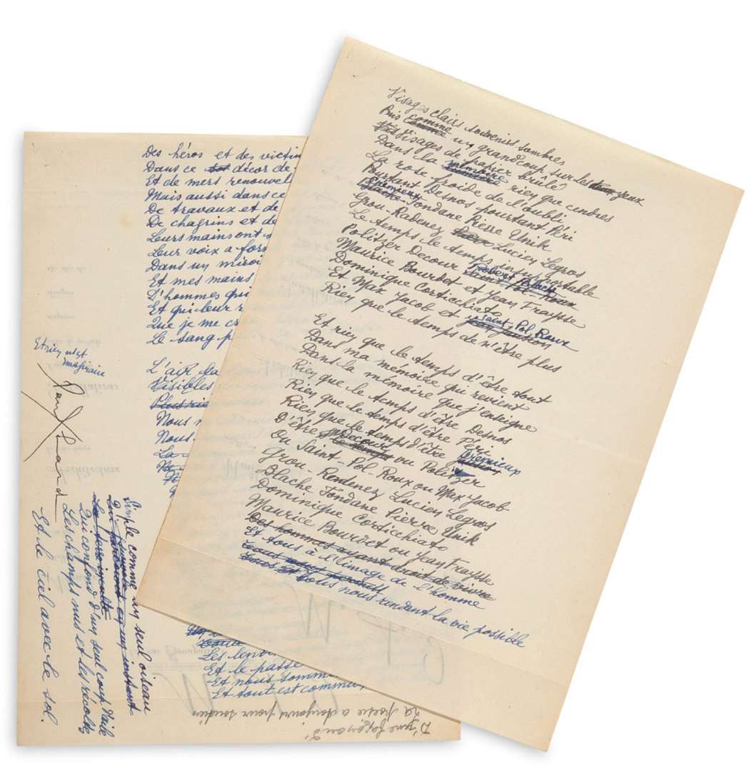 POÈME autographe signé « Paul Eluard », [Éternité de ceux que je n'ai pas revus, 1945] | 2 pages in-fol. au verso du papier à lettres de la galerie M. A. I. (le début manque).