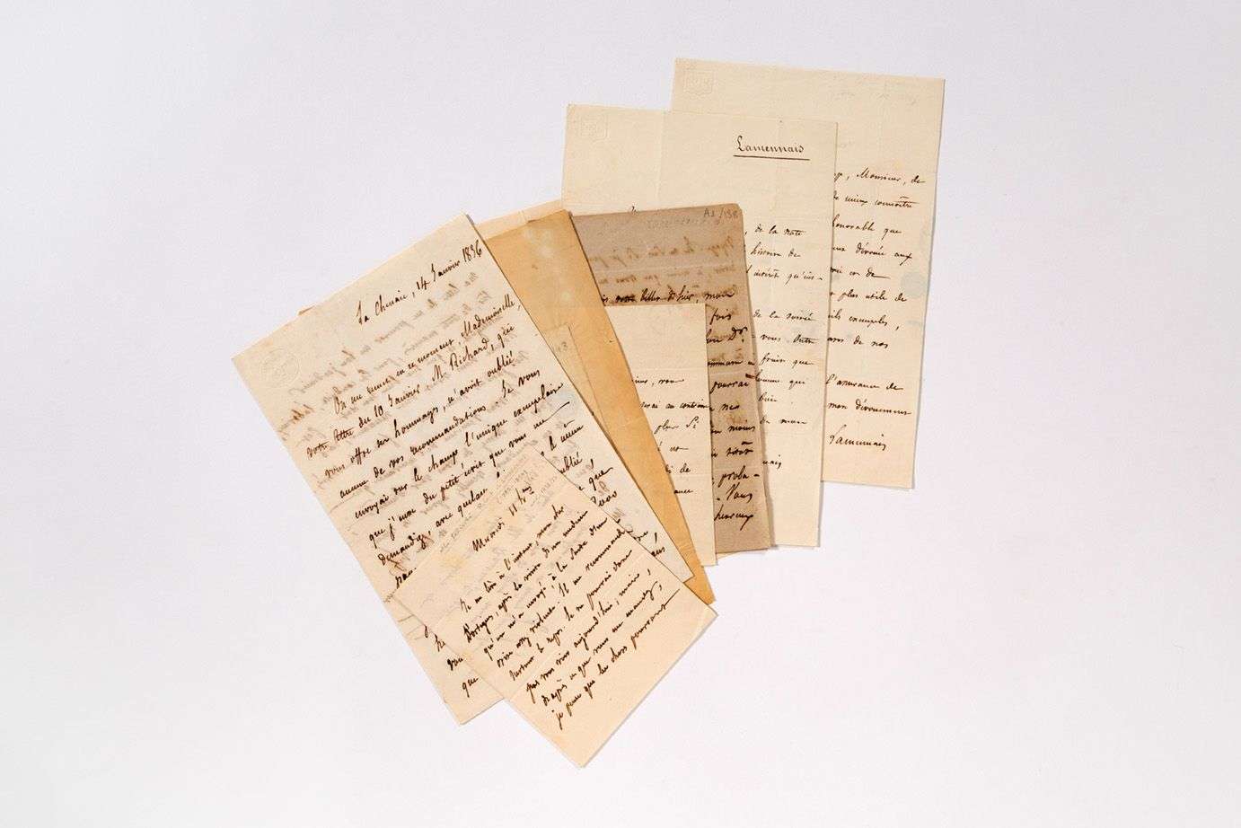 La Chênaie 14 janvier 1836, à Mlle Le Loutre à Saint-Brieuc. Il lui a envoyé sur le champ l'unique exemplaire du petit écrit qu'elle lui demandait... 26 décembre [1836 ?], à sa « bonne Claire » [BENOÎT-CHAMPY] : « On vous reporte Carl Sand. J'y joins les deux premières livraisons de mes oeuvres dites complettes. Les autres vous seront remises à mesure qu'elles paroîtront »... 23 janvier [1837], à A. Desgenettes, qu'il sera charmé de voir... 19 février [1837], à M. POUQUEVILLE, de l'Institut, le remerciant pour sa note sur Gustave-Adolphe, et sa belle Histoire de la Grèce... 22 mars 1837, à PONS de l'Hérault, le remerciant de lui avoir procuré « le moyen de mieux connoître les détails d'une vie aussi honorable que la vôtre, et aussi constamment dévouée aux intérêts de notre commune patrie et de l'humanité »... Paris 6 novembre 1838, à M. CHARRAS, capitaine d'artillerie à Mézières : remerciements pour le gibier, et annonce de l'envoi de « deux petits volumes » qui n'ont d'autre prix « que le sentiment sincère et profond d'attachement à la cause du peuple et des peuples, dont l'auteur ne cessera jamais d'être animé »...