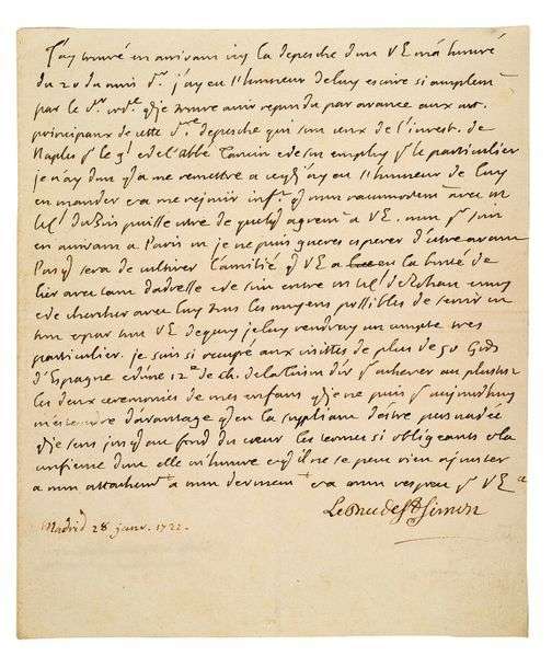 Belle lettre inédite, lors de son ambassade en Espagne pour demander la main de l'Infante au nom de Louis XV.