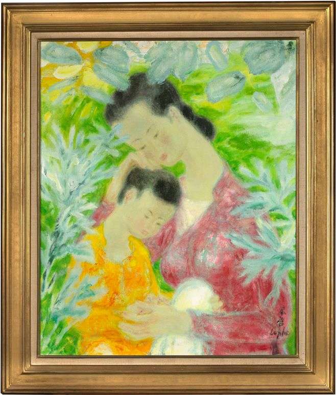 Tình mẫu tử cho thấy sự phát triển phong cách của người nghệ sĩ vào cuối sự nghiệp của ông, đánh dấu bằng những năm ông ở Pháp. Màu sắc đã được giải phóng và nhường chỗ cho một bảng màu sống động: vàng nghệ, hồng trà, vàng chanh, xanh xám lấp lánh trên khung vẽ. Khi công cụ được giải phóng, bút lực cũng khác hơn: những bông hoa trên nền được thực hiện với động tác ngẫu hứng, tạo thành bởi những vùng phẳng lớn. Ở thời kỳ này, Lê Phổ chỉ sử dụng canvas, một chất liệu xuất sắc của phương tây. Sự tự do đi kèm với nét cọ phóng khoáng là lí do để lựa chọn của một khung hình lớn hơn. Kích thước khung được sử dụng ở đây cho phép bố cục phù hợp hơn, giúp họa sĩ tự do sáng tạo. Nếu việc xử lý tác phẩm này đánh dấu một sự đổi mới trong phong cách của người nghệ sĩ, thì ta sẽ tìm thấy một số yếu tố bất di bất dịch từ nvày đầu cầm cọ của một họa sĩ bậc thầy. Đề tài về tình mẫu tử phù hợp với sự liên tục trong văn thơ của Lê Phổ, luôn luôn tiêu biểu cho sự dịu dàng của người mẹ. Hình tượng ấy rất đặc trưng. Nét đẹp Việt của bà mẹ và cậu con trai có thể nhìn thấy ở nét thon dài, nước da trắng mịn và mái tóc. Mặc dù đang trải qua những bước phát triển đáng chú ý, nhưng phong cách của Lê Phổ, họa sĩ tiêu biểu của lớp tốt nghiệp đầu tiên của Trường Mỹ thuật Hà Nội, đã trở nên phong phú nhờ những ảnh hưởng xung quanh ông, đồng thời duy trì một phong cách dễ nhận biết mà nguồn gốc Việt Nam mà ông tự hào.