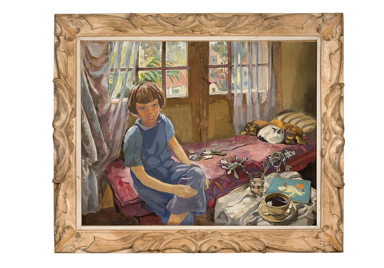 Mặc dù Alix Aymé là một trong những họa sĩ được chính phủ Pháp ủy nhiệm để quảng bá văn hóa Đông Dương, nhất là tại Đấu xảo Thế giới năm 1931, bà cũng đã phát triển một số tác phẩm theo phong cách vẽ studio. Lấy cảm hứng từ những người mẫu bản địa xung quanh mình nhưng cũng từ các người mẫu trong xưởng vẽ, bà đã dựng lên một tầm nhìn đầy mê hoặc về Đông Dương. Bức Fillette au chat dans l’atelier (Cô gái với con mèo trong studio) sử dụng những yếu tố đặc trưng của nơi bà đang sinh sống. Ở đây, ta thấy cửa sổ với rèm trong suốt và chăn bông màu hồng nhạt thường xuyên được tìm thấy trong các bức tranh từ thời kỳ này, đặc biệt là những bức tranh được đấu giá gần đây. Trong sáng tác này, Alix Aymé bất tử hóa một khoảnh khắc yên bình. Một cô gái trẻ đang ngồi ở mép giường, lặng lẽ chờ đợi. Tách trà gợi cho chúng ta nhớ đến khoảnh khắc thoáng qua, trong khi con mèo đang say ngủ và ván bài bị bỏ dở vương vãi đã nhấn mạnh sự dịu nhẹ của bầu không khí. Bảng màu tươi vui làm nổi bật tài năng tô điểm của Alix Aymé, một học trò của họa sư nhóm Nabis - Maurice Denis.