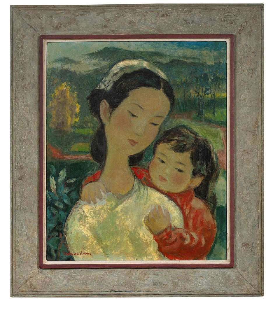 Vũ Cao Đàm sinh ra trong một via đình nhà nho, mê tiếng Pháp ngay từ nhỏ, ông trở thành một sinh viên tiêu biểu của trường Mỹ thuật Hà Nội. Tài năng đa dạng và óc sáng tạo đã được ông thể hiện trong suốt sự nghiệp thông qua một quá trình phát triển đáng nể về phong cách. Nếu người nghệ sĩ ấy bắt đầu với nghệ thuật điêu khắc rồi nhanh chóng cống hiến hết mình cho tranh lụa, thì bức Maternité được sáng tác trong thời kỳ then chốt, ngay trước khi ông áp dụng chất liệu sơn dầu trên canvas. Ông có cách tiếp cận chủ đề gần giống với các tác phẩm trên lụa. Hậu cảnh mang tính biểu trưng cho thấy một phong cảnh Việt Nam: Những ngọn núi phía xa được bao quanh bởi thảm thực vật và cây cối. Bảng màu rực rỡ và sống động gợi nhớ đến những bức tranh sơn dầu sau này của ông, nhưng sắc thái của màu sắc và sự vắng mặt của một tông màu chủ đạo khiến sự so sánh khônv còn quan trọng nữa. Giữa hai thời kỳ sáng tác, tác phẩm này lấy một chủ đề bất di bất dịch. Người mẹ và đứa trẻ hình thành nên mối quan hệ mẫu tử phản ánh xã hội Việt Nam. Khuôn mặt trái xoan, mái tóc đen như mun và đôi mắt hình quả hạnh gợi lại nguồn gốc của họ. Mặc dù được khung hình chỉ khắc họa bán thân nhưng có thể thấy trang phục áo dài truyền thống của người phụ nữ trẻ được kết hợp với khăn vấn. Chiếc cổ dài của cô gợi lên hình bóng mảnh mai trong tranh của các họa sĩ Kiểu cách Italy. Bằng cách chọn vẽ chân dung tượng bán thân của mình trước một khung cảnh xa xôi, Vũ Cao Đàm giúp chúng ta nhớ lại bài học của những họa sĩ Ý theo trường phái Nguyên sơ. Là một nghệ sĩ có tài năng xuất chúng, Vũ Cao Đàm cố gắng làm mới một chủ đề mà ông đã nhiều lần sử dụng và đưa ra ở đây một tác phẩm chịu những ảnh hưởng khác nhau, minh chứng cho sự nghiên cứu không ngừng trong quá trình phát triển phong cách của ông.