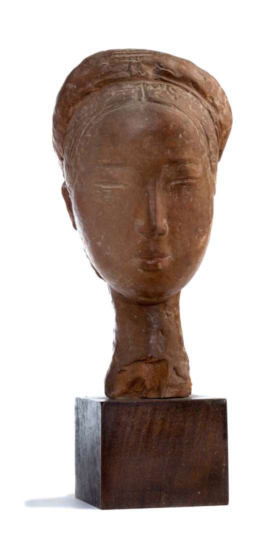 Bức tượng Tête de jeune femme rất đáng ngưỡng mộ này được làm bằng Terracotta (đất nung), thuật ngữ chỉ các tác phẩm điêu khắc làm bằng đất sét mô hình và trải qua quá trình nung, do đó hình thành một tác phẩm độc đáo. Để tránh tạo bong bóng hoặc túi khí trong quá trình nung, đất nung rỗng và có lỗ để không khí thoát ra ngoài. Hết sức khéo léo, Vũ Cao Đàm mang đến một tác phẩm độc đáo mà các đường nét, đặc điểm đều được chăm chút tỉ mỉ. Tính dễ uốn của chất liệu này cũng cho phép người nghệ sĩ thể hiện các nét duyên dáng của khuôn mặt phụ nữ, vải của khăn vấn hay thậm chí là kết cấu của tóc. Nếu hình dáng chung vẫn giữ được màu sắc tự nhiên của nó, người nghệ sĩ đã tô điểm thêm một lớp men đỏ tinh tế - có thể sử dụng bằng bút lông - trên đôi môi chúm chím của cô gái.
