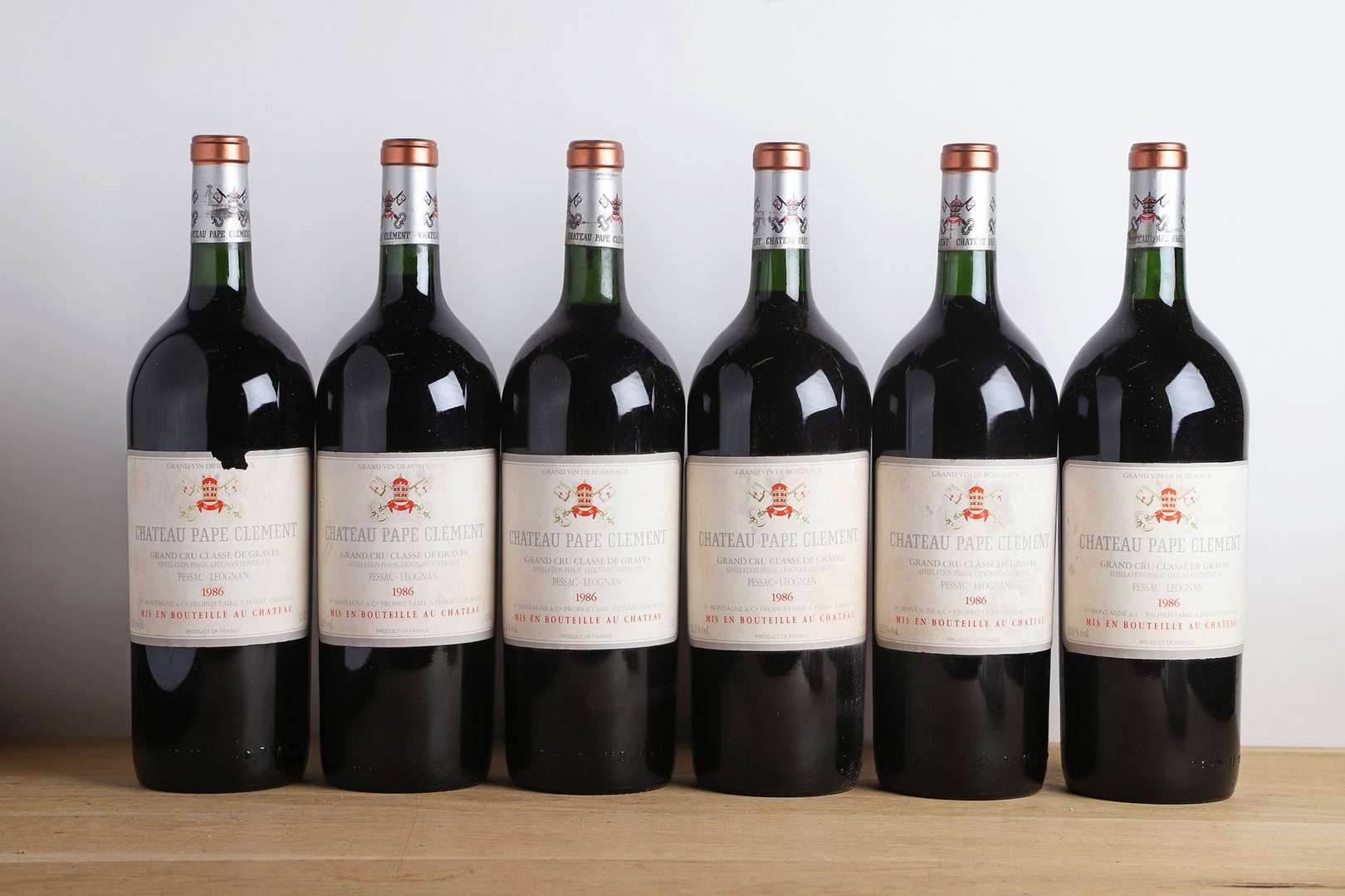 6 Mag CHÂTEAU PAPE CLÉMENT (Caisse Bois d'origine) (3 B.G| e.t.h. dont 1 e.t.a| 3 c.c| 1 c.a. côté) - 1986 - CC Graves