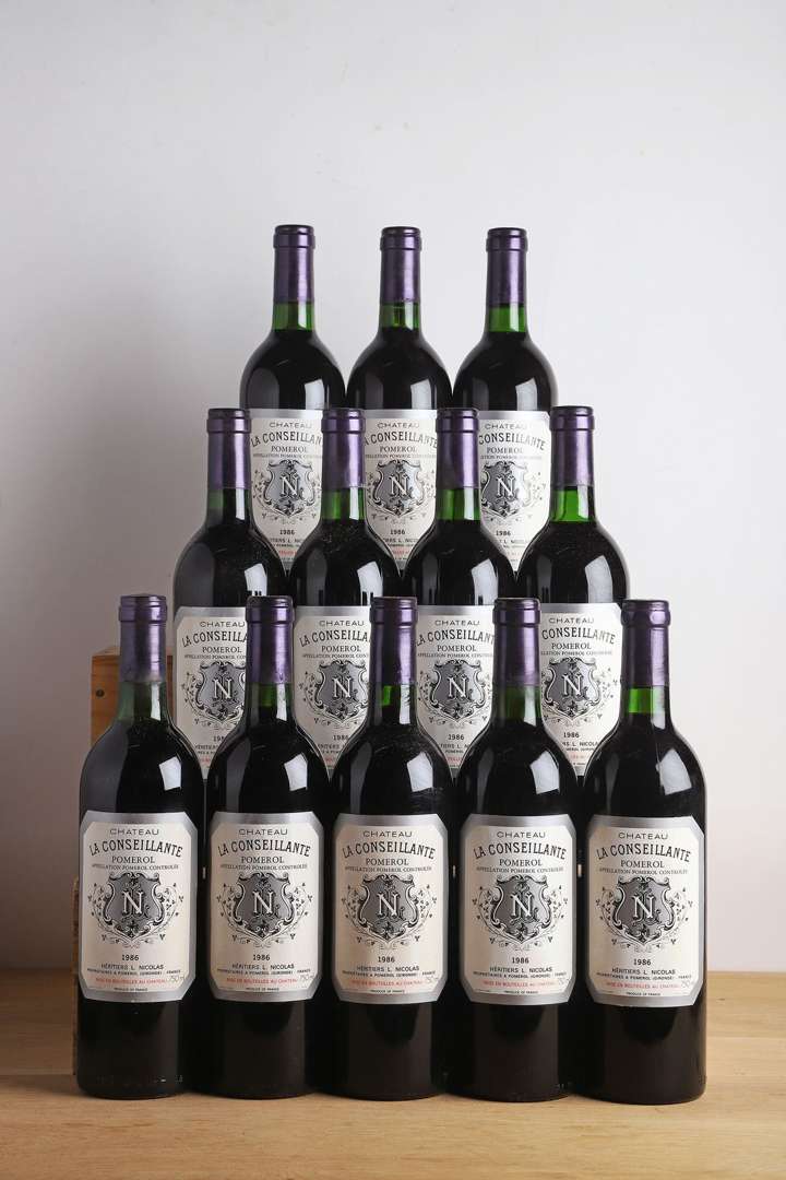 12 B CHÂTEAU LA CONSEILLANTE (Caisse Bois d'origine) (3 B.G| 2 B.G.- et 1 T.L.B.+| e.l.s.) - 1986 - Pomerol