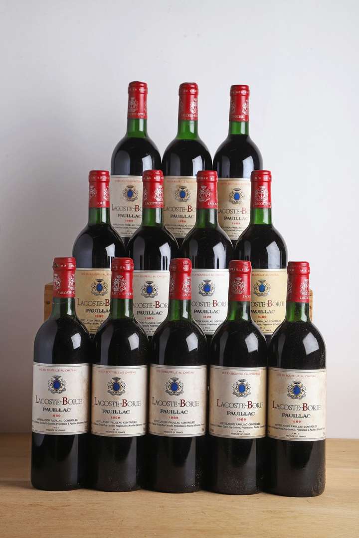12 B LACOSTE BORIE (Caisse Bois d'origine) (10 T.L.B. ou mieux et 2 H.E.+| e.t.h| 1 c.a. côté) - 1989 - Pauillac