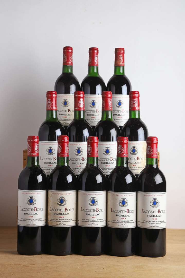 12 B LACOSTE BORIE (Caisse Bois d'origine) (10 T.L.B. ou mieux et 2 H.E.+| e.t.h. légères à e.t.h.) - 1989 - Pauillac