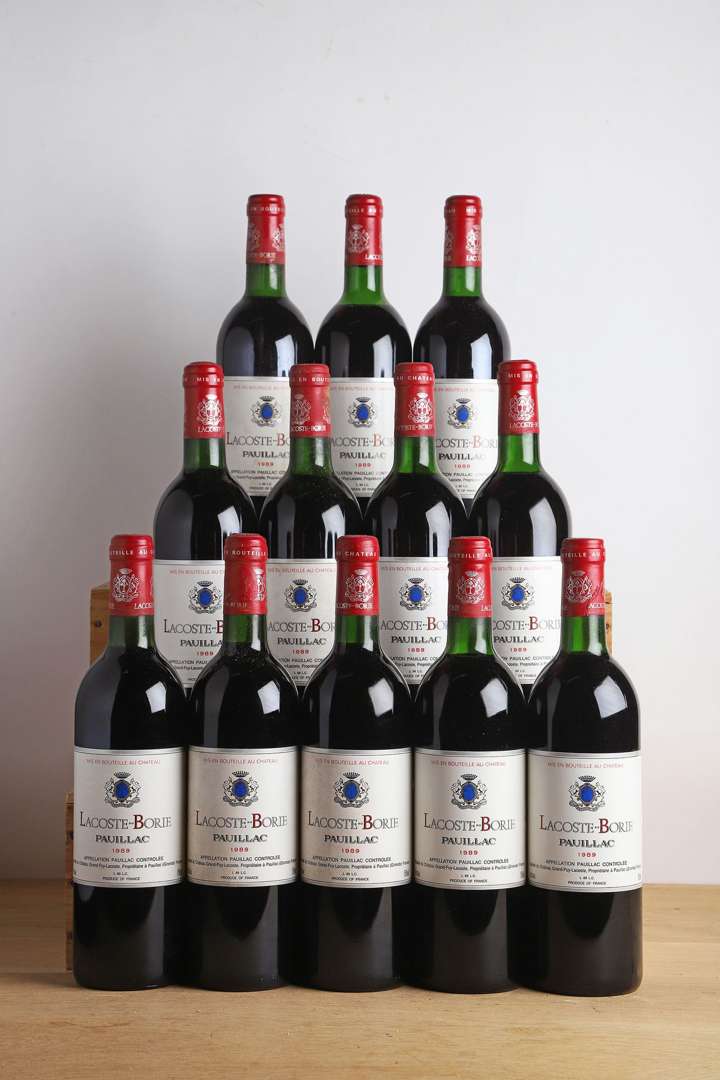 12 B LACOSTE BORIE (Caisse Bois d'origine) (11 T.L.B. ou mieux et 1 H.E.+| e.t.h. légères à e.t.h.) - 1989 - Pauillac