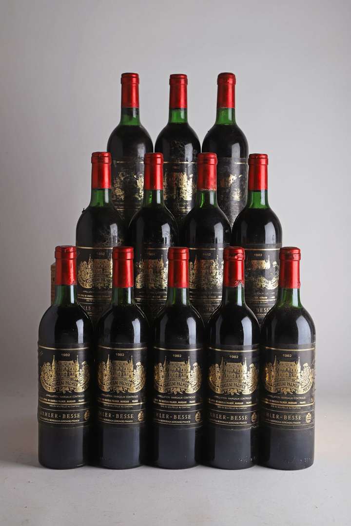 12 B CHÂTEAU PALMER (Caisse Bois d'origine sale) (2 B.G.-| 10 T.L.B| 3 e.t.h. légères| 1 e.l.a| 2 e.a| 5 e.t.a| 1 capsule gondolée| 2 c.a. bas de jupes et 1 c.a. côté) - 1982 - GCC3 Margaux