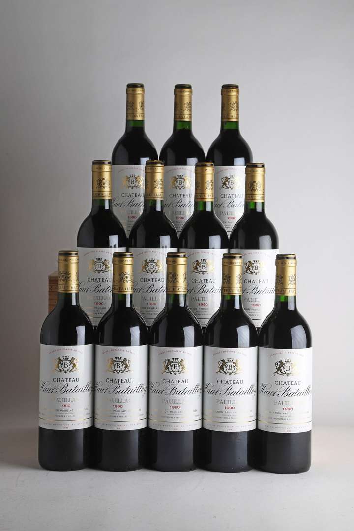 12 B CHÂTEAU HAUT-BATAILLEY (Caisse Bois d'origine) (2 capsules avec accrocs bas de jupes) - 1990 - GCC5 Pauillac