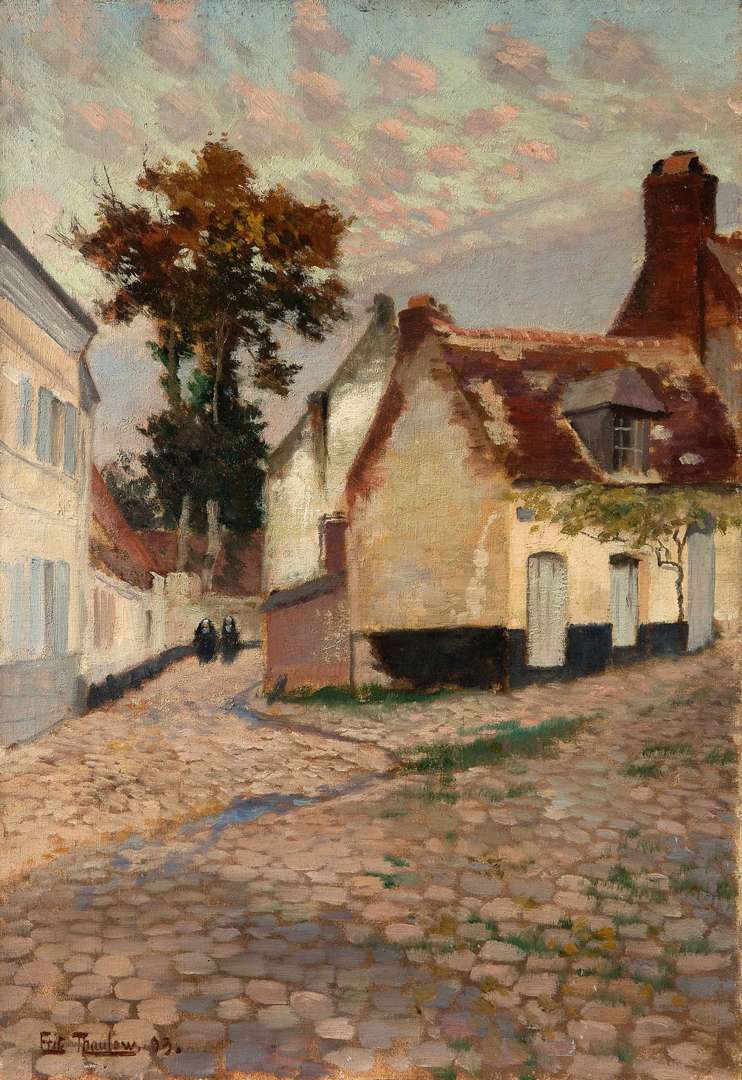 "En juin 1892, Frits Thaulow prend la route de Paris dans la perspective d'aller ensuite jusqu'à Venise. Mais c'est l'été et, toujours avide de sensations nouvelles, le peintre passe par la côte bordant le nord-ouest de la France. Tout début juillet, au nord du Touquet, station balnéaire reliée à Paris par le chemin de fer, et du port d'Étaples implanté sur la rive nord de l'embouchure de la Canche, la bourgade de Camiers se découvre au paysagiste norvégien, source d'émerveillement, tel un "coquillage rose dans le sable". Arrêté au hasard de sa musarderie, le couple Thaulow demeurera six mois dans la région, se replie également à Montreuil-sur-Mer à partir de septembre, parcourt la campagne à bicyclette, et séjourne l'hiver à Paris. Frits Thaulow découvre à Étaples non seulement une importante colo- nie de jeunes et joyeux artistes, mais aussi de véritables amis : Henri Le Sidaner, Émile Claus, Eugène Vail, et Henri et Marie Duhem, qui invitent les Norvégiens à passer l'été chez eux, à Camiers."