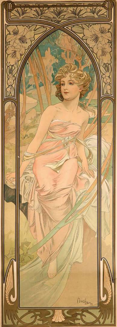 "À partir du moment où il saisit la valeur d'une telle popularité, l'imprimeur se décide évidemment à l'exploiter à fond. Dès 1896, il commande à Mucha ses premiers panneaux décoratifs - la série des quatre Saisons. Après cette première série de panneaux en apparaissent d'autres qui répètent plus ou moins le même schéma éprouvé et qui sont tirés des affiches de théâtre. Dans un format allongé, une figure féminine, un pourtour stylisé avec des détails réalistes. À la différence des affiches, les figures sont posées le plus souvent dans une partie découpée d'un paysage, utilisée ici comme un attribut et créant l'atmosphère. Le motif du cercle derrière une tête de femme revient souvent ici. Plus encore que dans les affiches, on se rend compte que ce n'est pas l'idée, mais la forme qui est captivante. On peut faire objection à beaucoup de choses, mais nous sommes captivés nous aussi par la pureté d'un profil rêveur, un flot de cheveux au vent, une merveilleuse parure et des plis de vêtements qui soulignent une silhouette d'une excitante beauté. Les fleurs, les cheveux et les courbes abstraites de l'arrière-plan composent une ornementation passionnante. C'est dans l'étonnante maîtrise et dans l'ordre intérieur de celle-ci que réside la principale force de Mucha. Il ne s'agit pas d'une ornementation inspirée des arts populaires de sa patrie, comme on l'a souvent affirmé, mais plutôt de la façon de traiter la surface et de juxtaposer les éléments naturalistes et les éléments stylisés qui est caractéristique des arts populaires de la Moravie du Sud dont il est originaire."