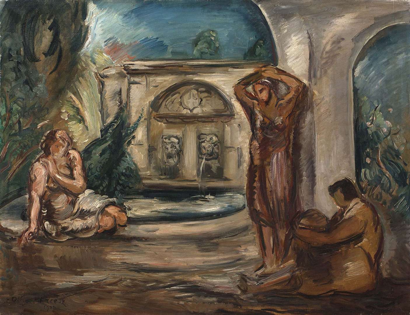 "1932. Une exposition d'œuvres choisies d'Othon Friesz (de 1908 à 1932), est qualifiée par René Jean, dans "Comoedia" (6 mai), d'apothéose. Et il la décrit simplement : "Ici, la chair féminine rayonne sous le ciel au bord d'un lac dont les eaux calmes se parent de reflets subtils. La fermeté éblouissante du nu vient se fondre dans la Nature, participer de sa grandeur, ajouter à sa mélancolique puissance. Ailleurs, au Jardin de l'Émir, les houris groupées sous les palmes. La chaleur estivale pèse sur les feuillages. Dans ce coin ombragé où l'eau jase dans les bassins, tout n'est qu'ordre et beauté, luxe, calme et volupté."