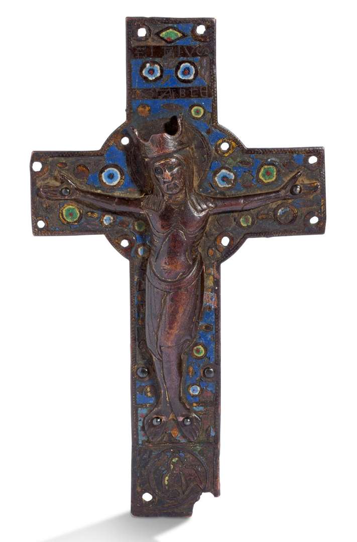 PLAQUE CENTRALE DE CROIX en cuivre champlevé, gravé, émaillé et doré avec Christ en applique, émaux bleu, bleu foncé, blanc, jaune, vert et rouge. Christ couronné avec tête légèrement inclinée vers son épaule droite, inscription sur deux bandeaux au-dessus, fond parsemé de cercles. Limoges, premier tiers du XIIIe siècle