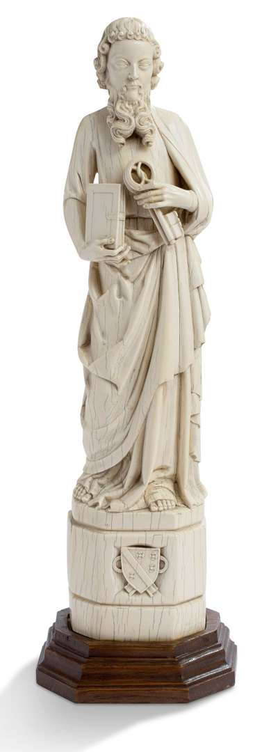 SAINT PIERRE en ivoire sculpté en ronde-bosse, il se tient debout, pieds nus, tenant dans sa main gauche les deux clefs emblématiques et dans sa main droite un livre. La partie inférieure formant piedestal octogonal sur lequel sont gravées les armes pontificales de Clément V (tronquée). Beau travail d'une seule pièce d'ivoire dans le style parisien de la fin du XIIIe siècle