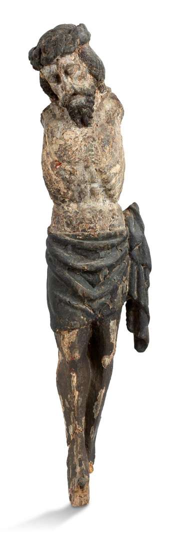 CHRIST en bois de résineux sculpté et polychromé. Tête penchée sur l'épaule droite ceinte d'une couronne d'épines entrelacées | cage thoracique saillante avec abdomen légèrement bombé | périzonium noué sur la hanche gauche avec chute latétale.Allemagne, vers 1400