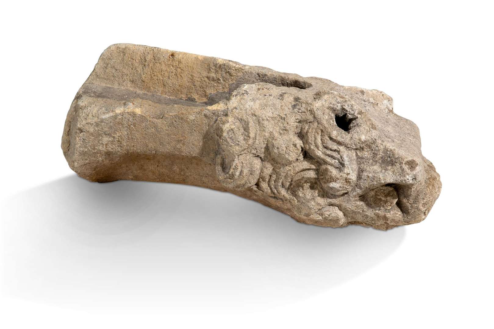 EXTRÉMITÉ DE GARGOUILLE à tête de lion en pierre calcaire sculptée. Bourgo