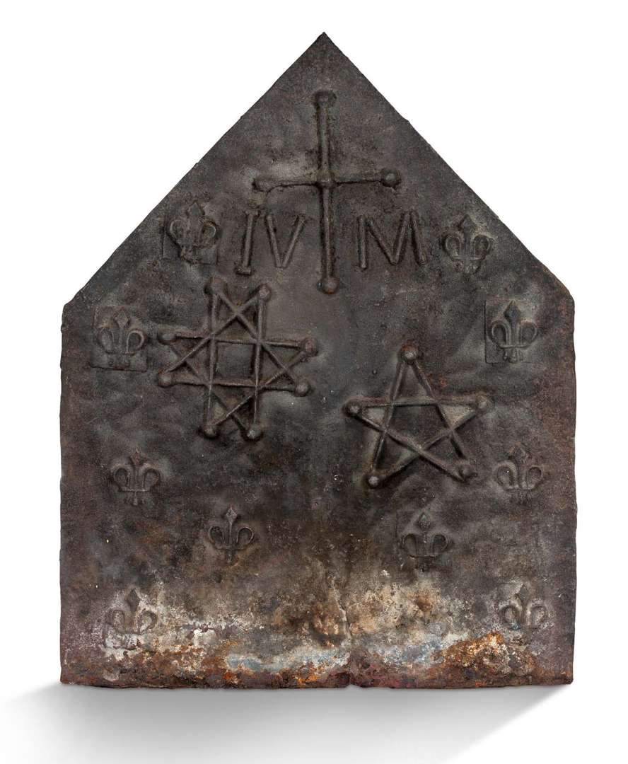 IMPORTANTE PLAQUE de cheminée en fonte de fer en forme de gable. Décor d'étoiles à huit et cinq branches, croix et fleurs de lys | lettres IVM. XVe siècle