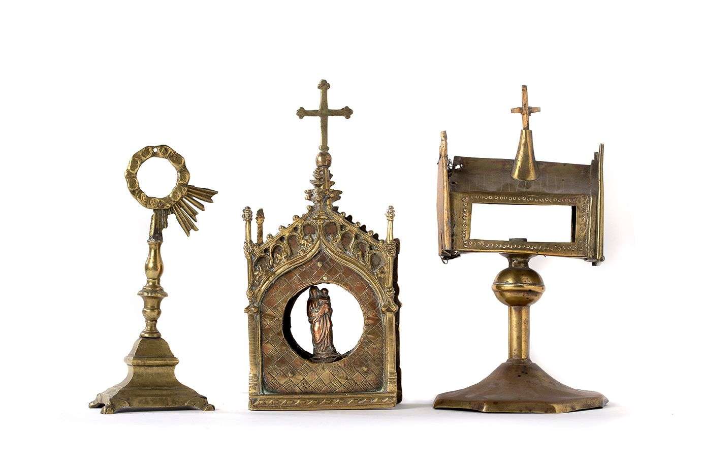 - de la partie supérieure d'un reliquaire monstrance en laiton moulé, gravé et doré avec pignons à gable fleuronné, contreforts et pinacles, surmonté d'une croix, ouvrant à une porte, faces à décor de damier percées d'un oculus, petite vierge à l'Enfant de pèlerinage.Limousin, vers 1500