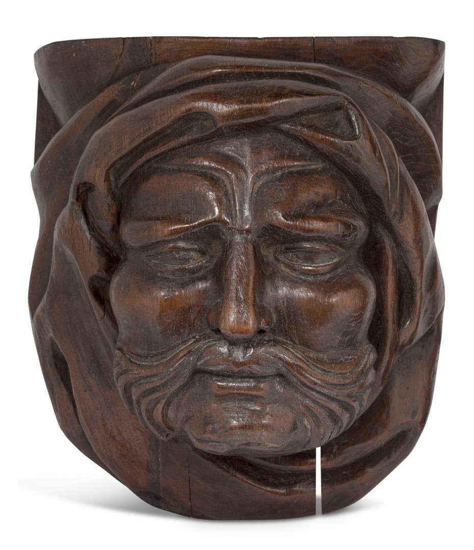 PAIRE DE CULOTS DE MISÉRICORDE en chêne sculpté en fort relief, représentant deux têtes d'homme aux traits accusés, l'une moustachue, l'autre à la chevelure mi-longue coiffée d'un chapeau à plumes.XV / XVIe siècle