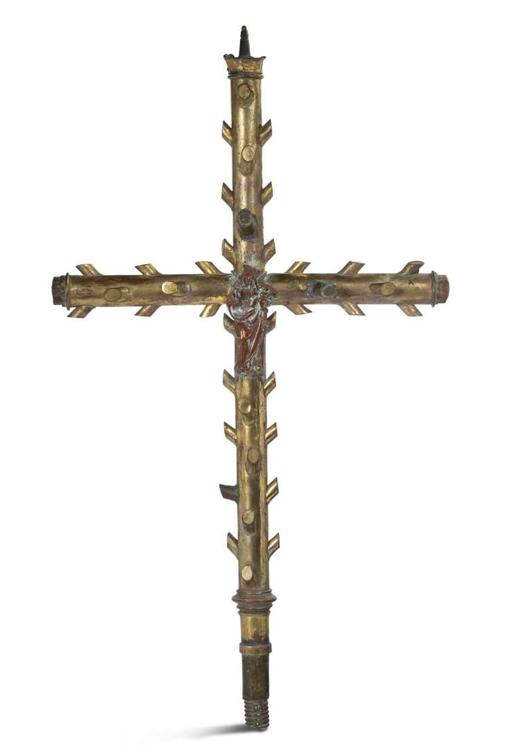 CROIX DE PROCESSION en cuivre doré sur âme en bois aux branches écotées, V