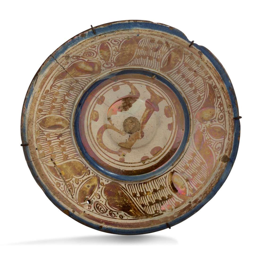 PLAT CREUX en faïence à reflets métalliques, lustre ocre et pigment bleu sur fond crème | ombilic orné de la lettre R, aile à décor de feuilles alternées sur fond de solfas. Au revers une roue centrale entourée de cercles concentriques. Étiquette : COLLECTION SAMSON DOCUMENTS ANCIENS.Manisès, seconde moitié du XVIe siècle