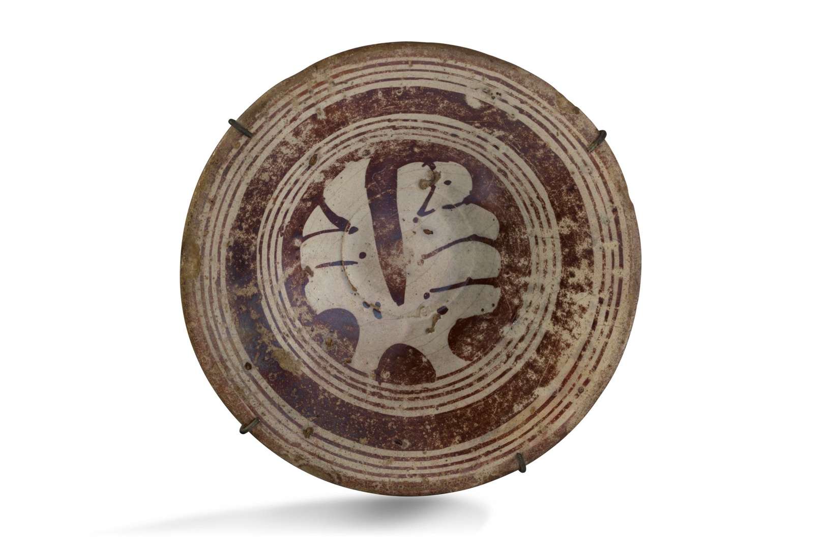 COUPELLE à reflets métalliques, lustre brun à décor d'une feuille fendue au centre entourée de cercles concentriques | revers avec spirale filiforme inachevée.Atelier aragonais, Muel ?, fin du XVIe siècle