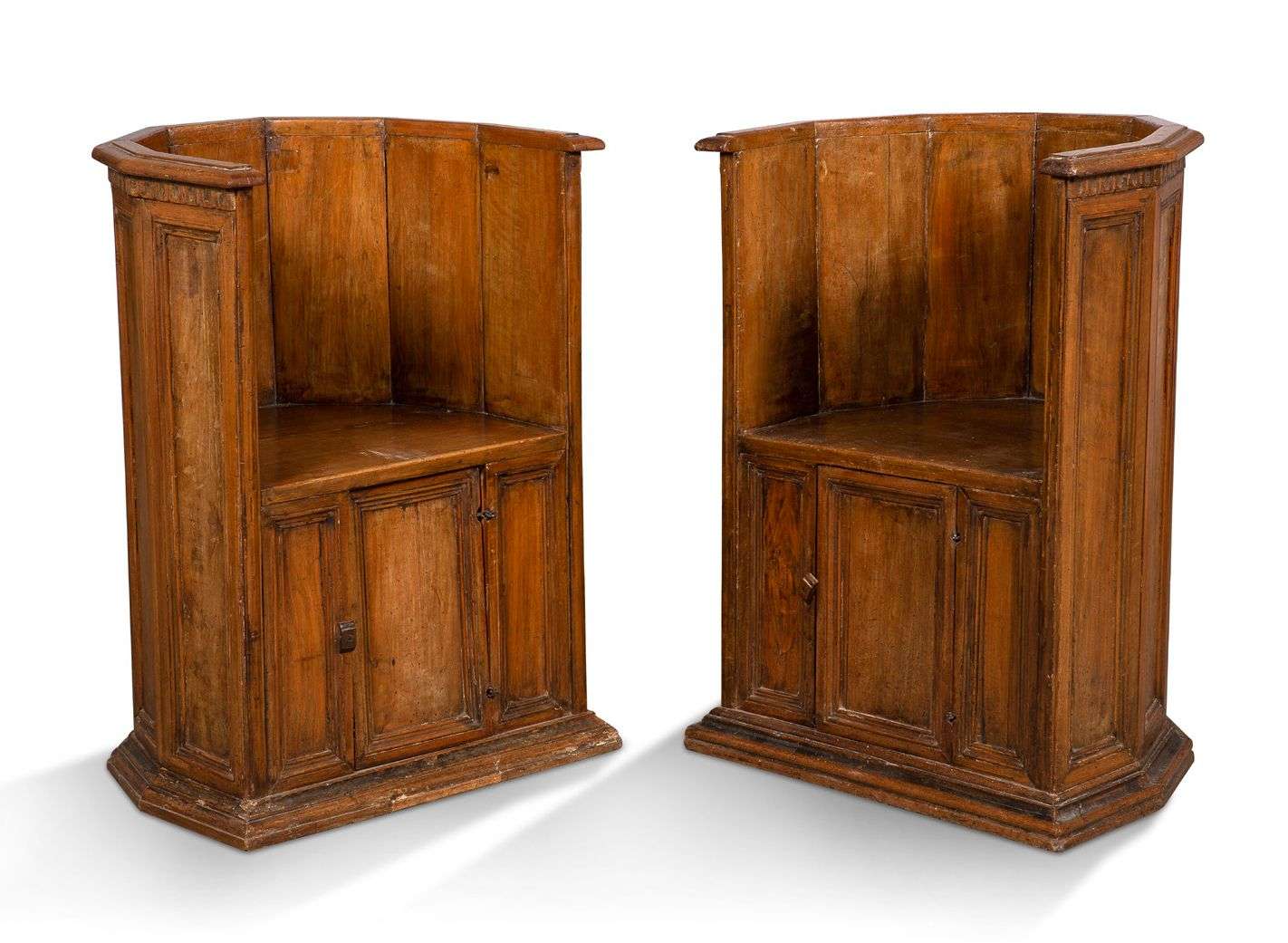PAIRE DE SIÈGES DITS SEDILE A POZZETTO en noyer mouluré avec partie basse formant armoire et dossier à sept pans de forme cintrée. Florence, fin du XVe / début du XVIe siècle