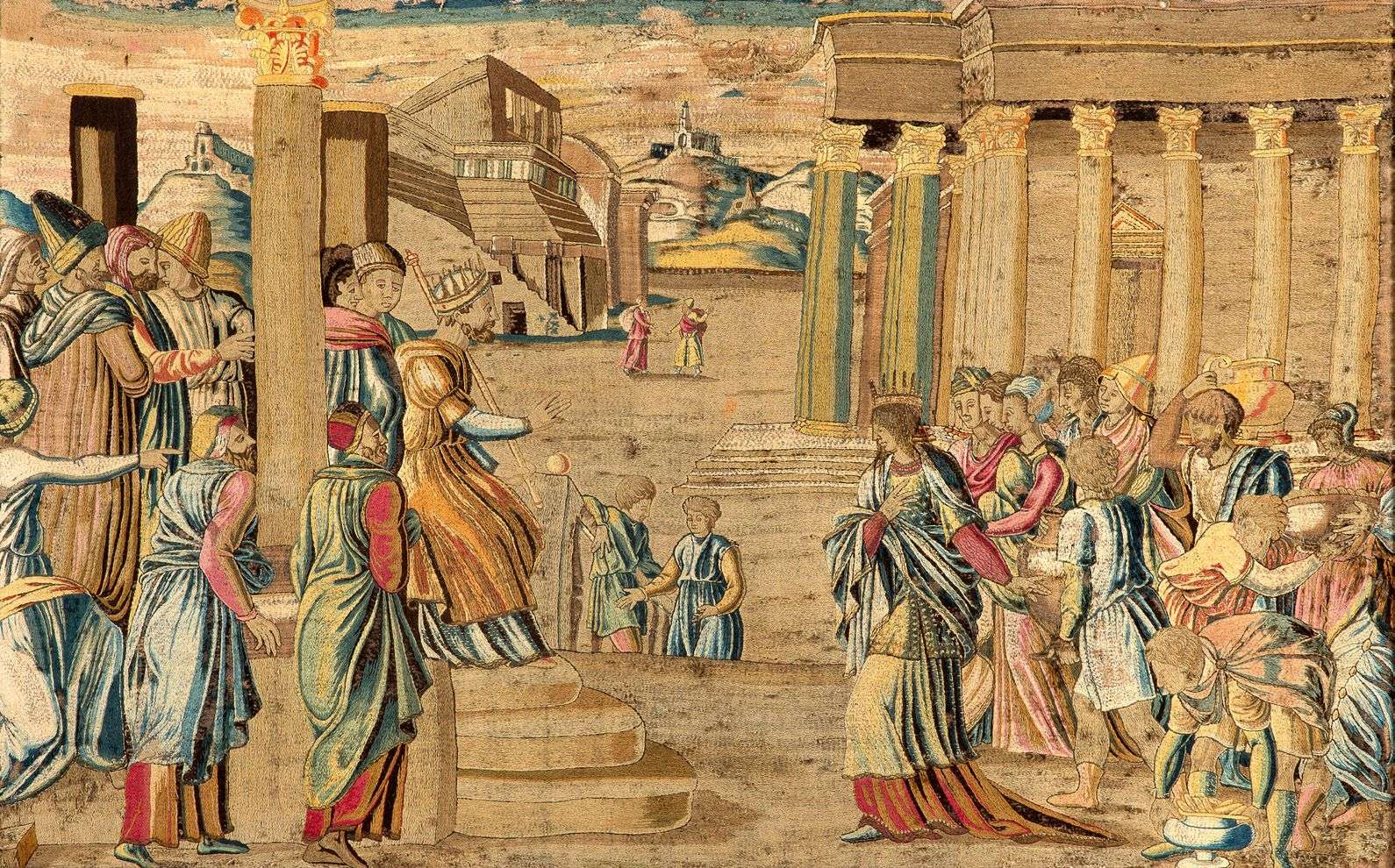 RARE BRODERIE en fils de soie polychrome au point fendu représentant la Rencontre de la reine de Saba et de Salomon d'après une gravure de Marc-Antoine Raimondi, vers 1520. Entouré de sa cour, le roi des Hébreux, assis sur une estrade et adossé à une colonne, reçoit la reine de Saba accompagnée de sa suite | la scène se déroule sur fond d'architectures classiques, colonnades et temple, avec une échappée vers un paysage au centre. Italie, milieu du XVIe siècle