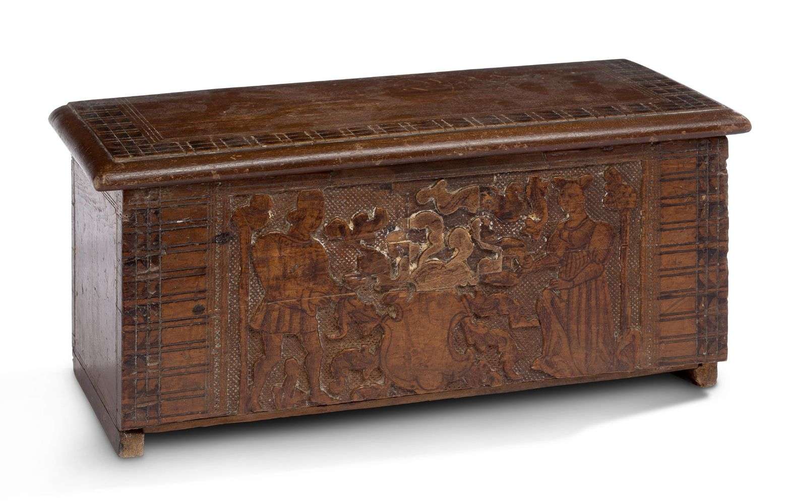 COFFRET à thème courtois en bois de cyprès à décor sculpté en réserve et rehaussé d'encre. Façade ornée des époux se présentant leurs offrandes, la femme coiffée d'un escoffion, autour d'un écu en forme de cartouche | intérieur muni d'une éclipette.Italie du Nord, Frioul, première moitié du XVIe siècle
