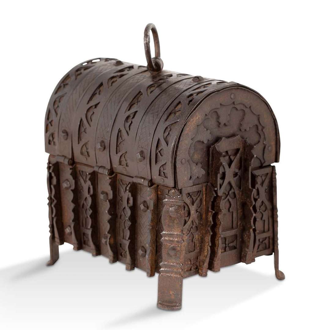 COFFRET à couvercle bombé en fer forgé et ajouré à décor d'orbevoies. Pentures cloutées, contreforts découpés et anneau sommital. Mécanisme d'ouverture à secret actionné par des ressorts fixés sous la base. XIXe siècle, dans le style gothique