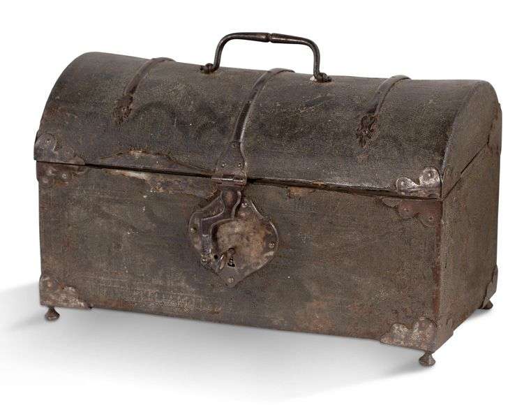 COFFRET au couvercle bombé à âme en chêne recouvert de cuir bouilli à décor d'entrelacs. Poignée sommitale, pentures fleuronnées, serrure à moraillon, cornières découpées et pieds aplatis en fer forgé | clef.Seconde moitié du XVIe siècle