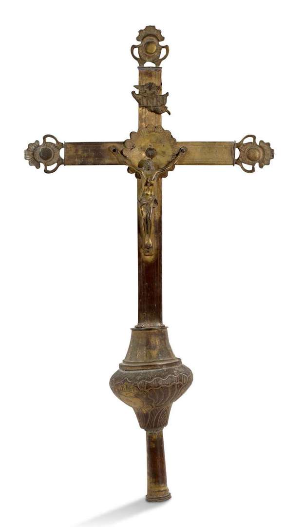 CROIX PROCESSIONNELLE en cuivre doré sur âme en bois. Christ sur la face e
