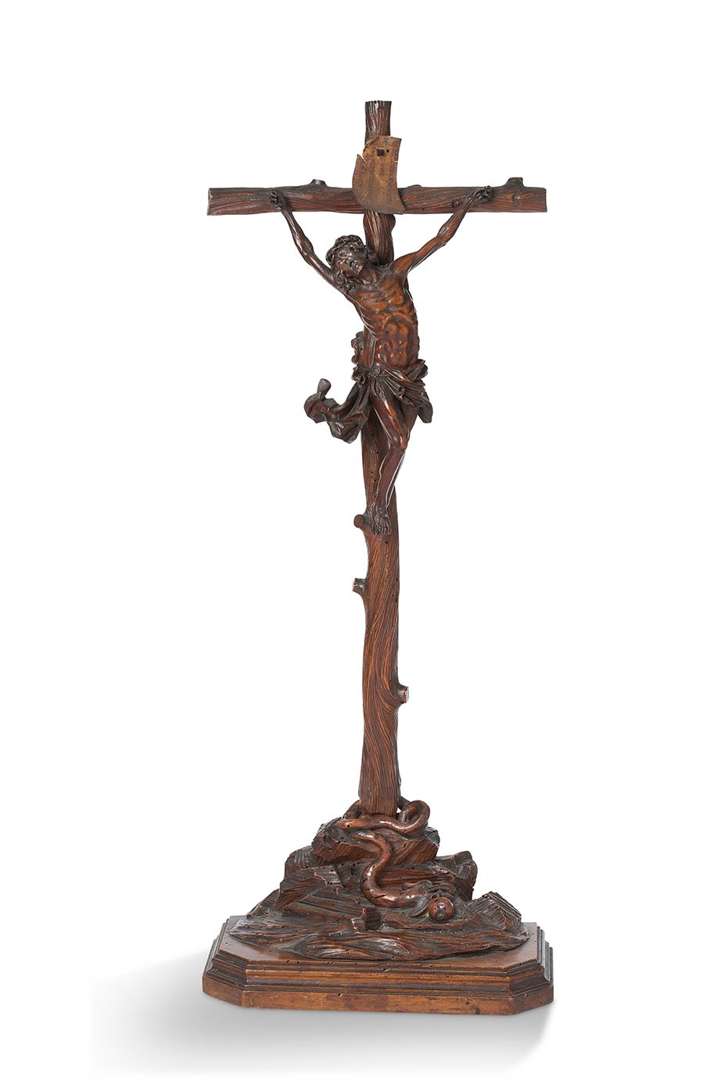 CRUCIFIX avec Christ en bois fruitier sur un tertre en forme de rocher sur lequel reposent le serpent et la pomme de la Tentation. Allemagne, XVIIe siècle
