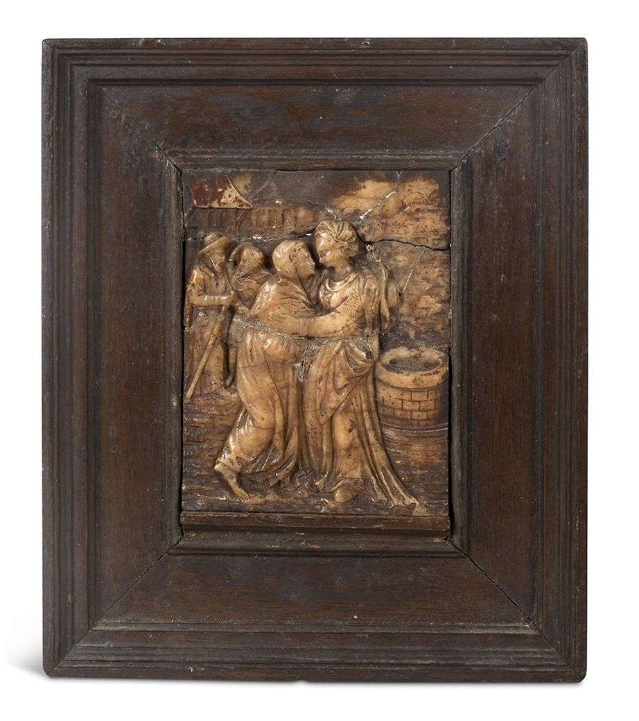 Lot de trois bas reliefs en albâtre composé de :- une Annonciation, avec monogramme IDH à l'or. (Hauteur : 13 cm - Largeur : 10 cm)- une Visitation (Hauteur : 12 cm Largeur : 9 cm)- une Pentecôte, avec monogramme IDH à l'or (Hauteur : 13 cm - Largeur : 10 cm)Malines, atelier de Jasper de Hemeler (né en 1587).