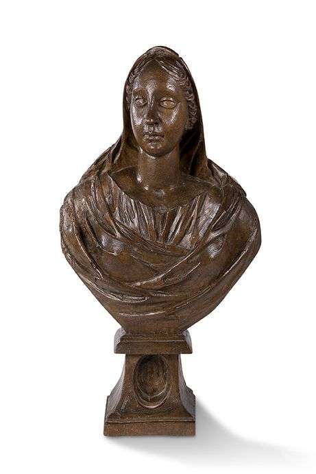 BUSTE RELIQUAIRE d'une sainte Femme en noyer, le socleà doucine avec niche ovale pour la relique.Fin du XVIIe siècle
