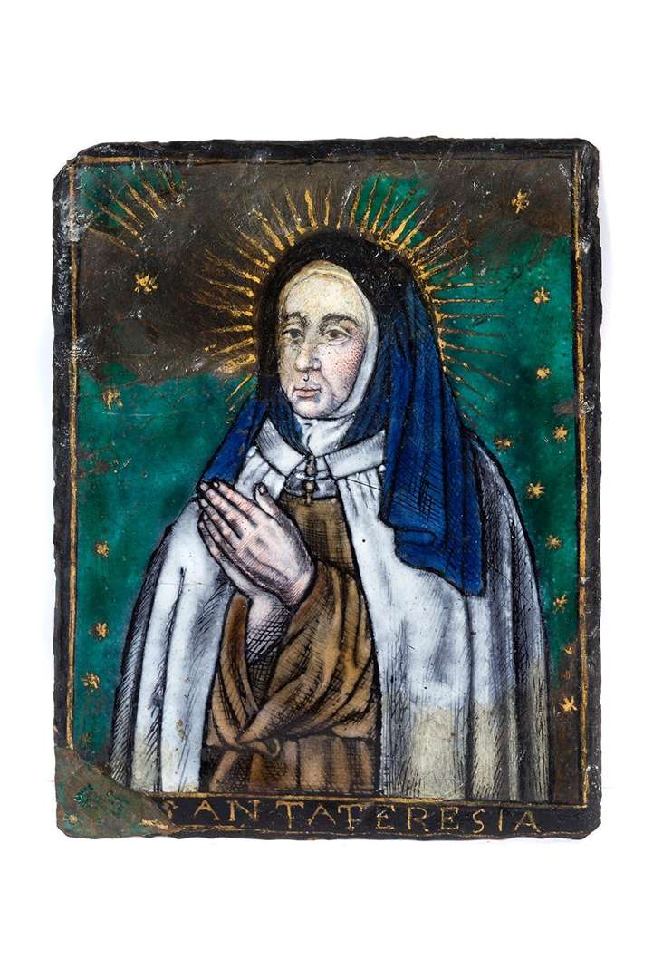PLAQUE en émail peint sur cuivre représentant Sainte Thérèse sur un fond vert étoilé. Insciption « Santa Teresia » dans la partie basse.Limoges, XVIIe siècle