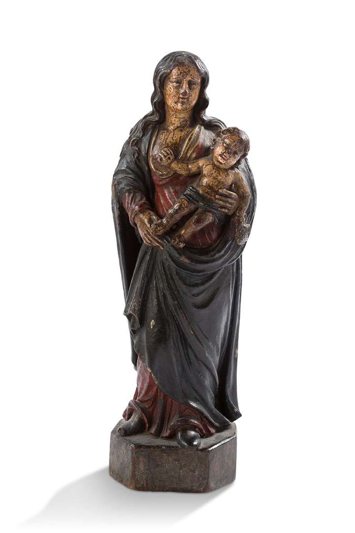 VIERGE À L'ENFANT allaitante en bois sculpté en ronde-bosse et polychromé. L'Enfant tient la colombe du Saint Esprit d'une main et le sein de sa Mère de l'autre. Inscription et date ANNET / DELALANDE / 1670 sur la base à pans peinte à l'imitation du marbre. XVIIe siècle, 1670