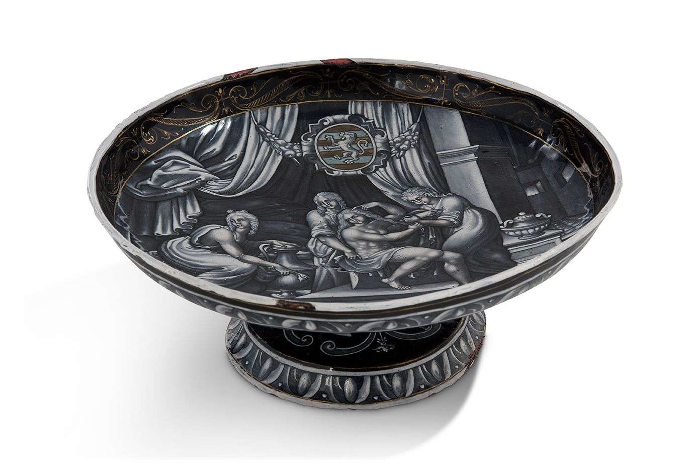COUPE SUR PIED en émail peint en grisaille avec rehauts d'or représentant la Toilette de Vénus. Paris, maison Samson, dans le style des émaux de Limoges de la Renaissance, fin du XIXe siècle