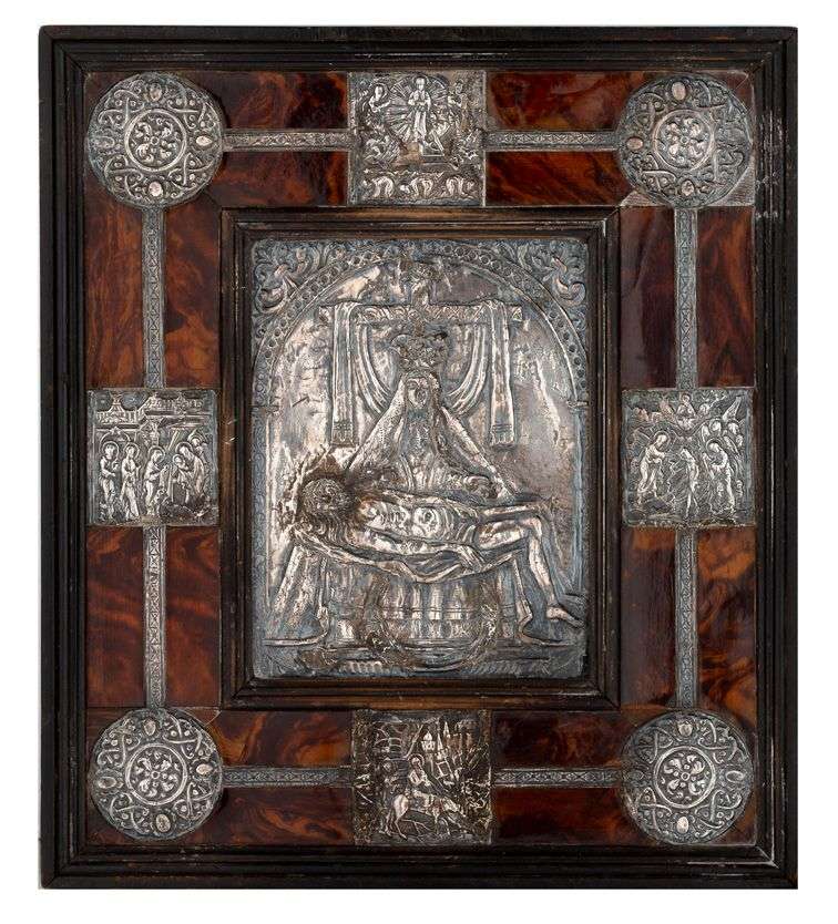 FEUILLE D'ARGENT REPOUSSE formant tableau représentant la Vierge de Pitié majestueuse, couronnée au pied de la Croix dans un cadre en bois noirci mouluré et placage d'écaille de tortue orné de plaquettes d'argent repoussé figurant la Transfiguration, l'Adoration des Mages, le Baptême du Christ et l'Entrée du Christ dans Jérusalem, rosaces aux angles. Veneto-byzantin ?, XVIIe siècle