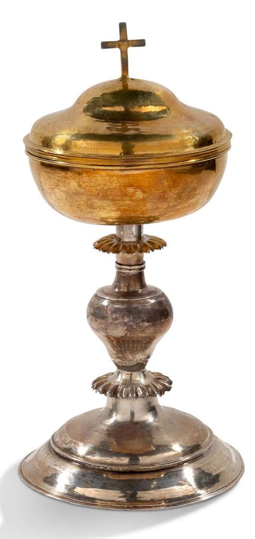 CIBOIRE en argent avec coupe en vermeil. Base circulaire moulurée, tige en balustre entre deux collerettes, couvercle à dôme avec croix sommitale. Trois poinçons dont deux illisibles. Pays-Bas, Zwolle, premier tiers du XIXe siècle