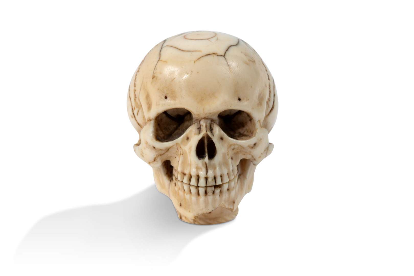 POMMEAU DE CANNE en ivoire sculpté, memento mori, représentant un crâne naturaliste aux mâchoires fermées. XIXe siècle