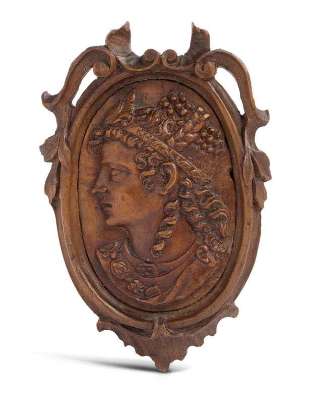 MÉDAILLON OVALE en bois fruitier de type prunus sculpté en fort relief figurant une tête féminine à l'antique de profil | chevelure aux mèches ondulées retenue par un diadème et des rangs de perles | encadrement à décor de feuillages et de volutes. Inscription à l'encre au revers Sibilla Cumes... XVIIe siècle