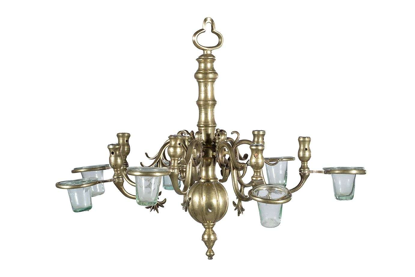 PETIT LUSTRE DE SYNAGOGUE en bronze, à sept bras de lumière amovibles. Fût tourné. Binets avec porte-verrine. XVIIe siècle On y joint des verrines.