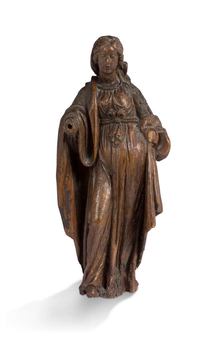 VIERGE OU SAINTE FEMME en bois sculpté en ronde-bosse. Debout et légèrement déhanchée, elle est revêtue d'une robe ceinturée et d'un manteau ouvert. Fin du XVIIe / début du XVIIIe siècle