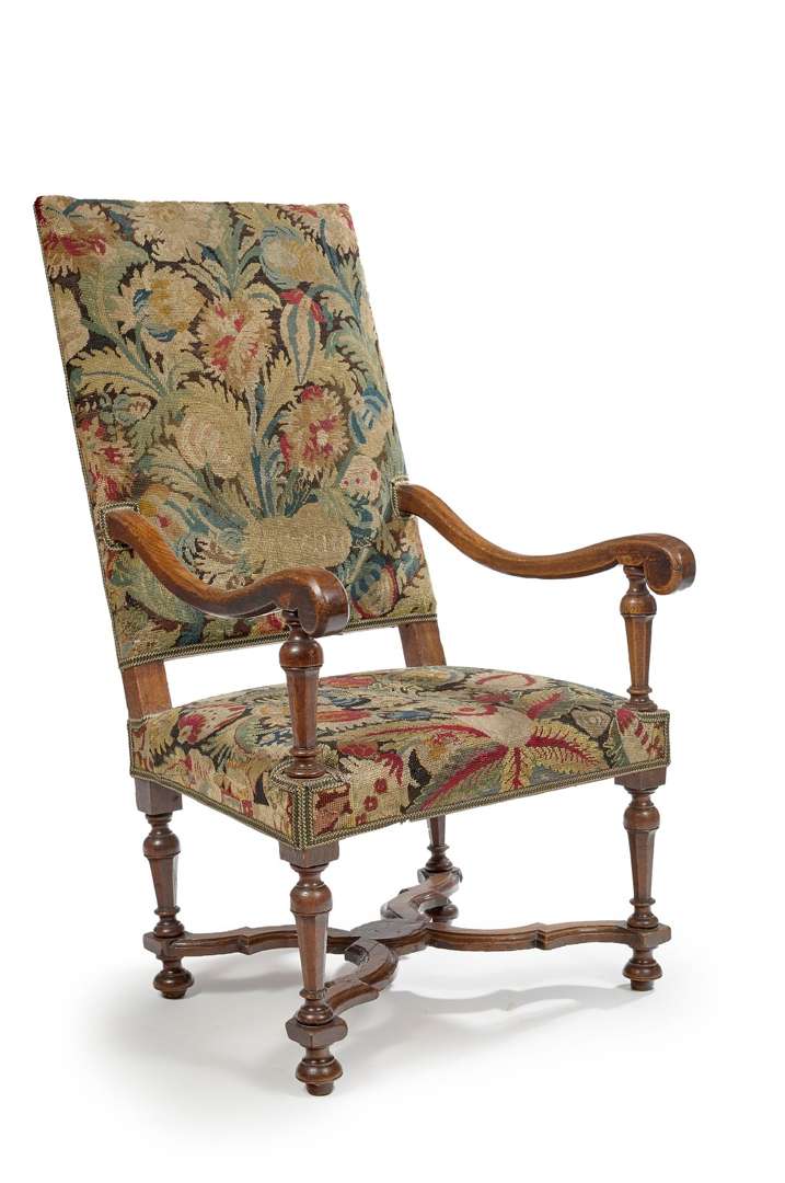Un fauteuil à pieds balustres en gaines octogonales et entretoise en X en chêne mouluré. France, XVIIe siècle