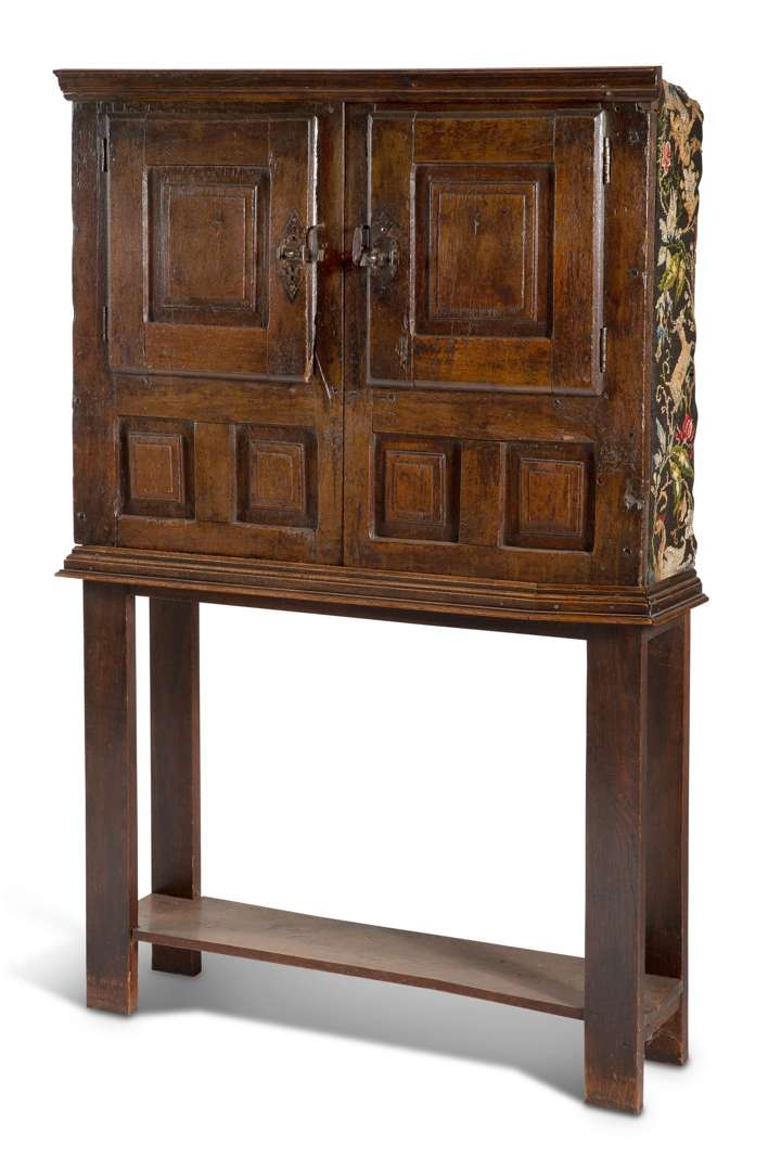 CABINET CRÉDENCE à panneaux en chêne patiné ouvrant à deux vantaux dans la partie supérieure, targettes de fer forgé. Auvergne, en partie du XVIIe siècle. Les côtés garnis d'une tapisserie aux animaux fantastiques.