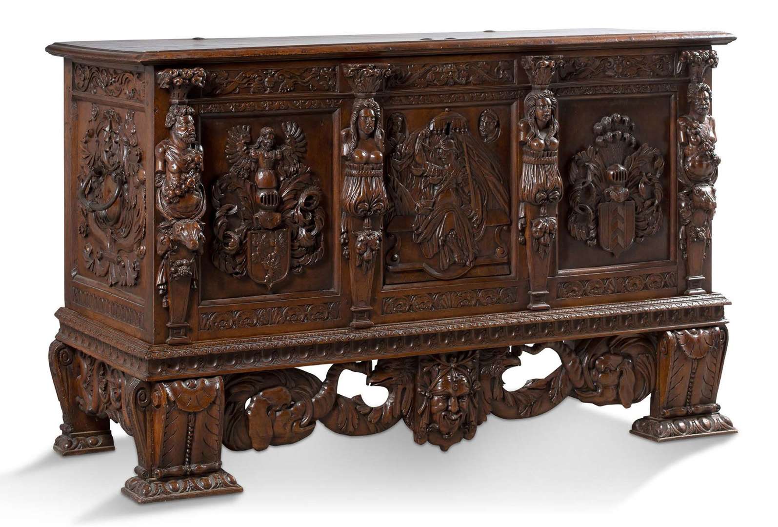 RARE COFFRE DE MARIAGE NEUCHÂTELOIS en noyer richement sculpté. La façade est ornée de trois panneaux encadrés de quatre colonnes de termes à décor de deux personnages féminins et deux masculins surmontant des têtes de cerfs. Le décor des panneaux de façade présente les armoiries de la famille de Watteville sur le panneau gauche et de la famille de Neuchâtel sur le droit. Le panneau central est une allégorie de la Justice tenant l'épée et la balance, elle se tient sous un dais surmontant l'entrée de serrure du meuble, encadrée de deux visages dans des médaillons, un féminin à gauche, l'autre masculin à droit. Le coffre est encadré de frises à décor de rinceaux et de dragons sur la façade et les parties latérales dont les panneaux sont ornés de chimères et rinceaux. Le coffre repose sur un large et imposant piètement à décor de frises d'entrelacs et propose un soubassement à décor ajouré d'éléphants entre lesquels siège un visage d'homme grotesque. Présence d'une serrure sous le panneau central et de deux grandes anses en fer forgé sur les panneaux latéraux. Dans le coffre, des pentures joignant dos et abattant du meuble sont ciselées. L'abattant du coffre ouvre sur un espace comprenant un autre petit coffre en partie gauche.Suisse, Neuchâtel, fin du XVIe, début du XVIIe siècle