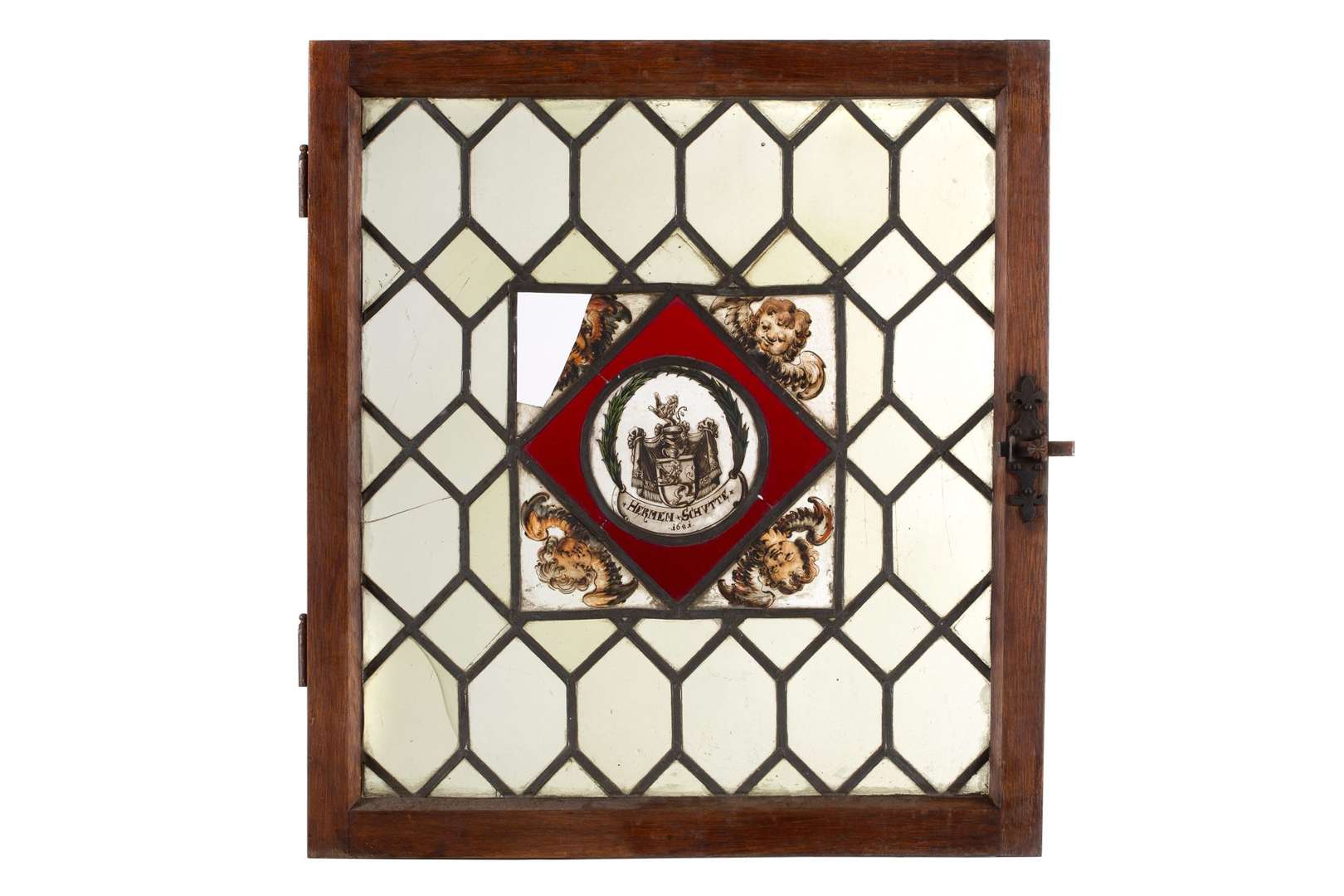 VITRAIL composé de fragments en grisaille et jaune d'argent et verres rouges avec, au centre, des armoiries accompagnées de l'inscription HERMEN.SCHVTTE. et de la date 1681, cantonnées de quatre têtes d'angelot. Pays germaniques, seconde moitié du XVIIe siècle, 1681 Dans un encadrement de fenêtre