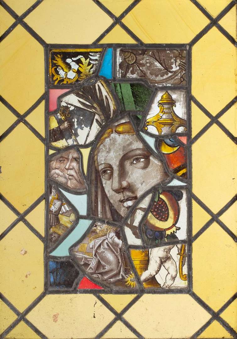 VITRAIL composé de divers fragments polychromes, en grisaille et jaune d'argent : visages, draperies, armoiries... XV / XVIe et XVIIe siècles Dans un encadrement de fenêtre